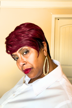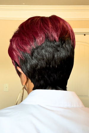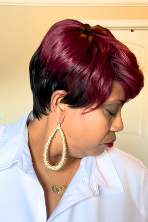 “The Monica” human hair wig has a vibrant burgundy color at the front and top of the wig. It then becomes dark brown/black to the nape of the neck. This also includes portions of both sides of the wig. She is a short pixie with a tapered nape of the neck, creating a bold and sophisticated look. Light and airy, durable, and easy to maintain.
